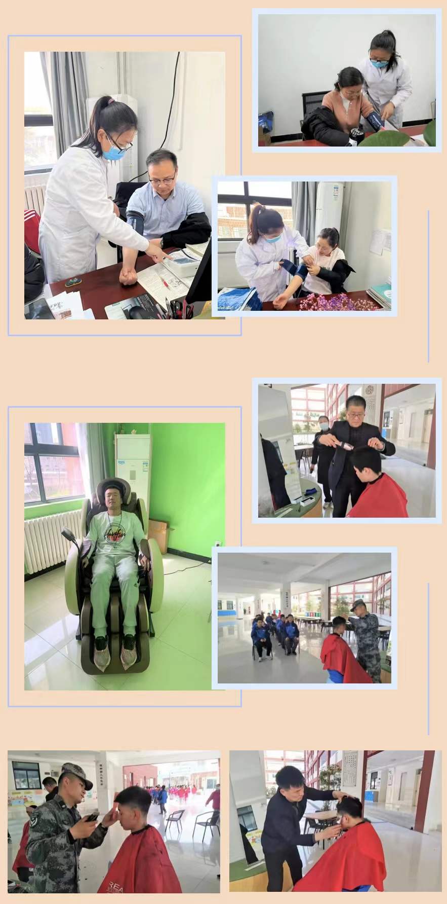 “心中有雷锋,时时学雷锋。”教师志愿者开展形式多样的“学雷锋”活动。老师与教官利用休息时间为同学们义务理发,保持了学子们良好的精神风貌;校医为老师们义务测量血压,关心教师身体状况,关注教师身心健康;在心理老师的指导下,教师们体验音乐放松椅,缓解压力,舒缓情绪,为今后的教育教学工作充电续航。