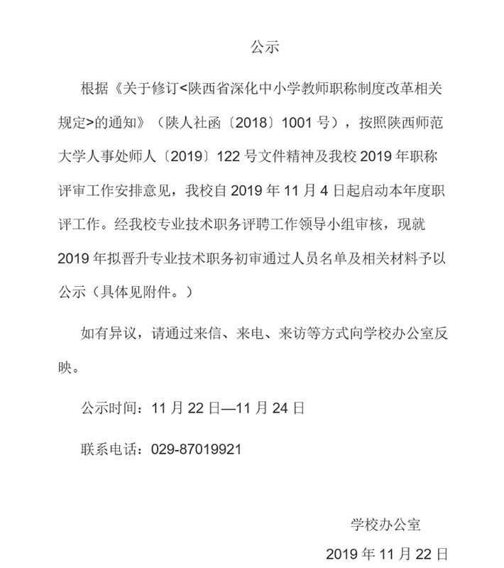 陕西师范大学杨凌实验中学2019年拟晋升专业技术职务初审通过人员名单及相关材料公示