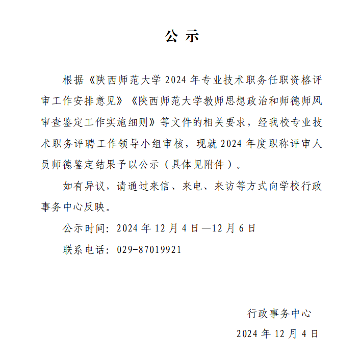 陕西师范大学杨凌实验中学2024年拟晋升高一级职称参评人员师德鉴定初审结果公示